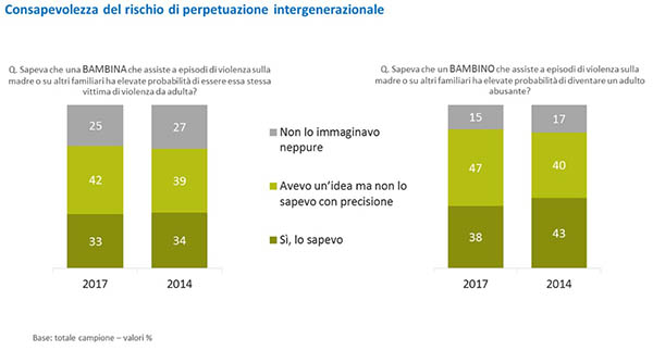 Il 23 novembre sono stati presentati i risultati di una indagine "La percezione della violenza contro le donne e i loro figli", condotta da Ipsos per conto di WeWorld Onlus, organizzazione non governativa che da quasi 20 anni promuove e difende i diritti dei bambini e delle donne a rischio in Italia e nel mondo. È stata l'occasione a distanza dalla precedente ricognizione, del 2014, per fare un bilancio dell'opinione di un campione di 1000 persone (49% uomini, 51% donne tra i 18 e i 65 anni) intervistate nel mese di ottobre 2017, su una serie di affermazioni in tema di stereotipi di genere (tra parentesi la somma delle percentuali di chi è molto d'accordo o abbastanza d'accordo):