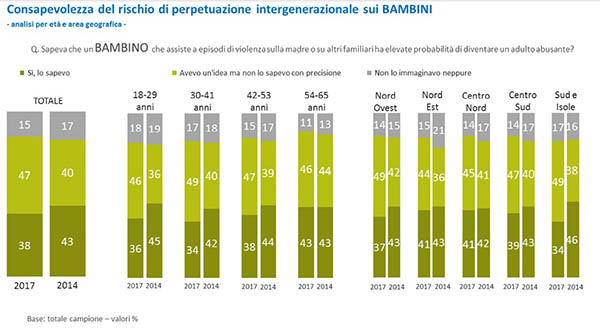 Quando la violenza colpisce anche i bambini, spettatori involontari della violenza domestica. Quest'anno la ricerca Ipsos-WeWorld si concentra lungamente su questo aspetto. Secondo l'ultima indagine Istat del 2015 il numero delle violenze a cui sono esposti i figli è pari al 65,2% e nel 25% dei casi sono stati in prima persona vittime della violenza. Quanto è conosciuto questo fenomeno? A quanto pare poco, se il 49% del campione dichiara di non esserne al corrente, soprattutto nella fascia 30-41 anni. Scarsa conoscenza del fenomeno, che però viene percepito come assai grave: secondo l'84% i bambini sono vittime al pari delle donne e secondo l'83% possono sviluppare disturbi psicologici, emotivi o relazionali. Purtroppo si tende ad ascrivere il problema della violenza assistita intrafamiliare maggiormente agli ambienti degradati a livello socio-culturale o economico, non ne si percepisce la trasversalità. Intervenire per tempo nei casi di violenza assistita significa interrompere la trasmissione intergenerazionale della violenza, perché gli effetti come sappiamo sono permanenti e influenzano i comportamenti da adulti.