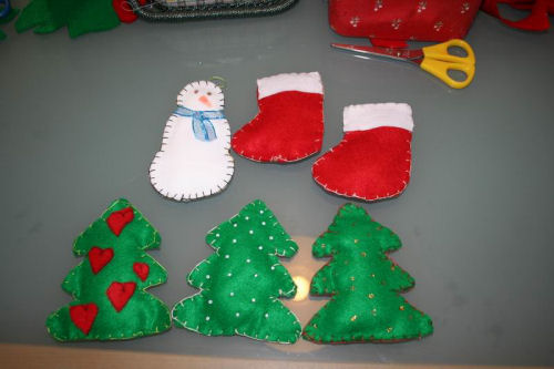 Prima ha realizzato le sagome che ha fatto ricopiare sul pannolenci da Flavia, poi la bimba ha fatto le decorazioni ed infine hanno imbottito di ovatta e chiuso con il punto festone.