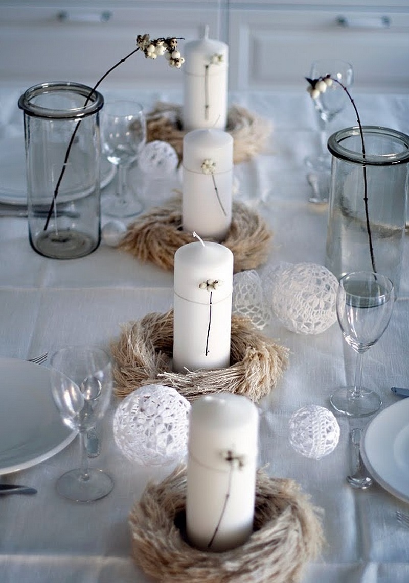 La semplicità dei colori naturali ben si abbina a delle decorazioni in corda e palline ricamate all'uncinetto.